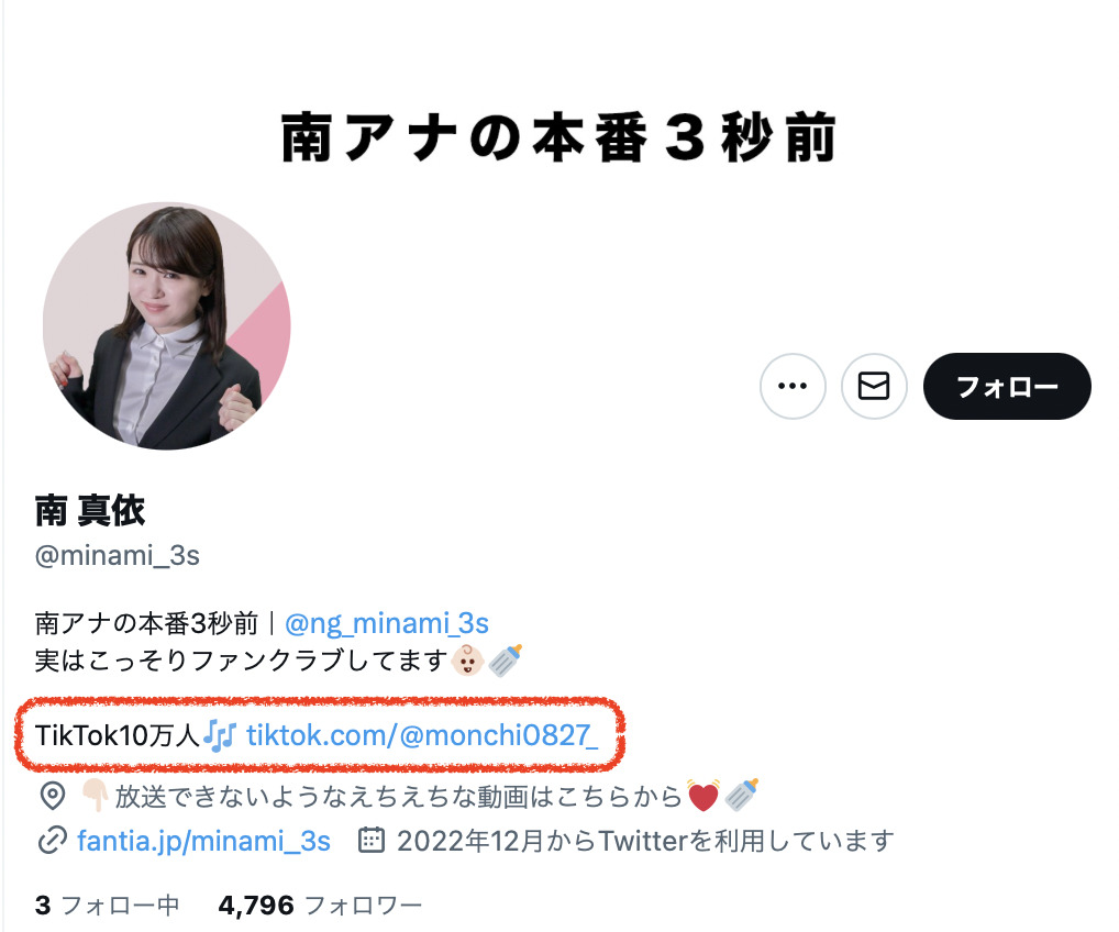 Twitterを見てみると南真依の名前とTikTok10万人のあとにmonchi0827_のアカウントリンクがあるため、同一人物だとわかります。
