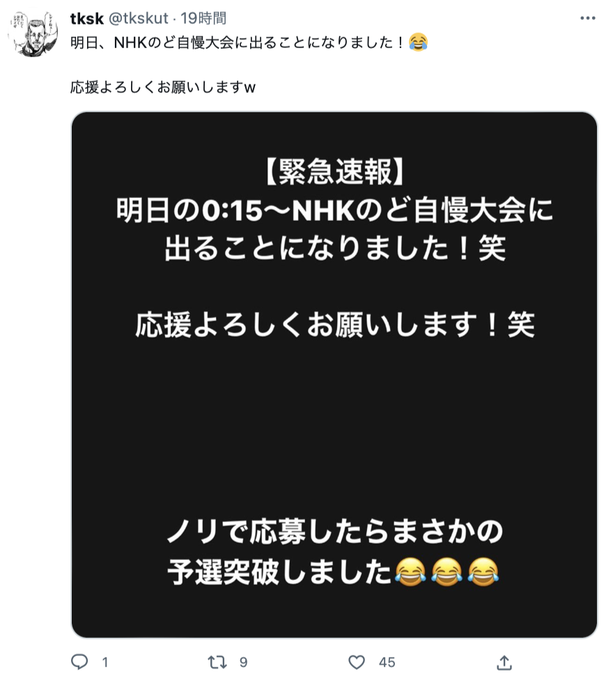 NHKのど自慢を観ていて、優勝したタカサキさんの活躍をTwitterで投稿されています。