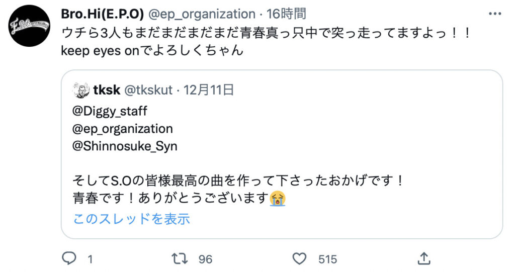 タカサキさんが投稿したTwitterで、元SOUL'd OUTのメンバーのBro.Hi(ブラザーハイ)さんも反応されています。